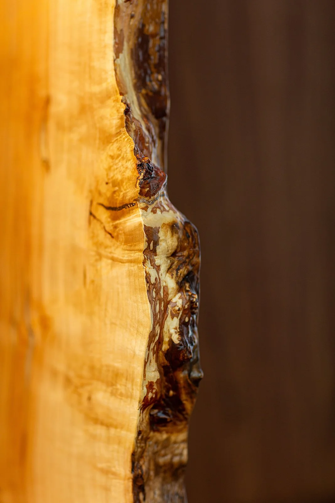 Custom cabinetry featuring grain-matched walnut, a figured maple slab sliding entry door, accompanied by a custom concrete countertop with an integral sink, bathroom accessories, and wall and shower sills.
